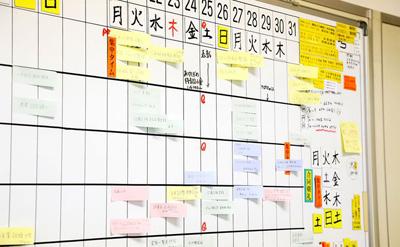 総務部では、担当業務をホワイトボードに付箋で貼って見える化。個人の業務量や締切などを部署内で共有して、フォローし合う体制を作っている。また、急な休みにも対応できるよう、デスクの引出しも全スタッフが分かるように、整理の仕方を共有している。